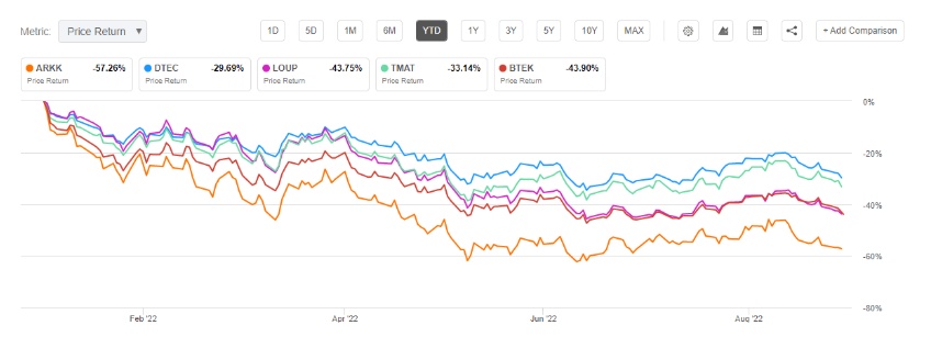 2022年表现超过ARKK的其他四只创新科技基金分别为ALPS Disruptive Technologies ETF (DTEC.US)、Innovator Loup Frontier Tech ETF (LOUP.US)、Main Thematic Innovation ETF (TMAT.US)和Future Tech ETF (BTEK.US)。