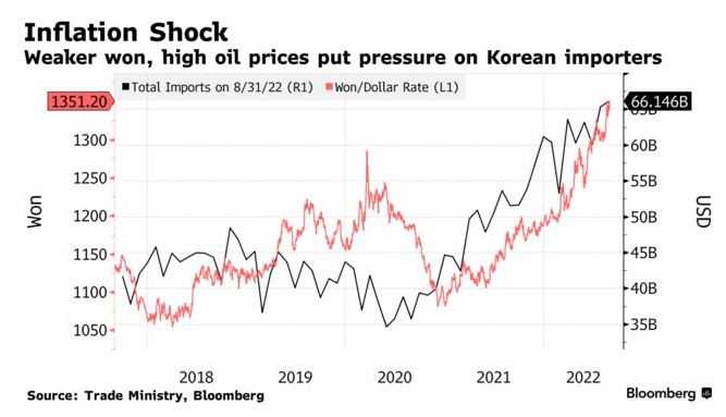 在俄乌冲突导致原材料价格居高不下的情况下,通胀给韩国的工资带来了上涨压力。与此同时,韩元汇率徘徊在13年低点附近,也使得这个依赖贸易的国家进口能源、食品和其他物品的成本上升。