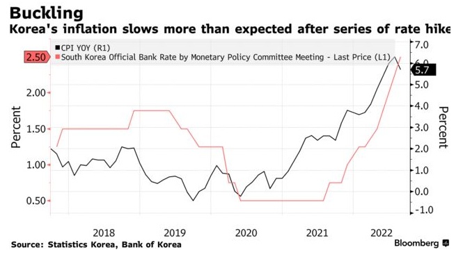 尽管目前驱动全球通胀上升的因素依然强劲,但能源和食品价格最近已从高位下降。韩国此前也一直预计通胀将在10月左右见顶。