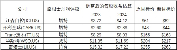 如上表所示,摩根士丹利对这些股票都上调了目标价,并给予江森自控、开利全球及Trane技术“增持”评级。