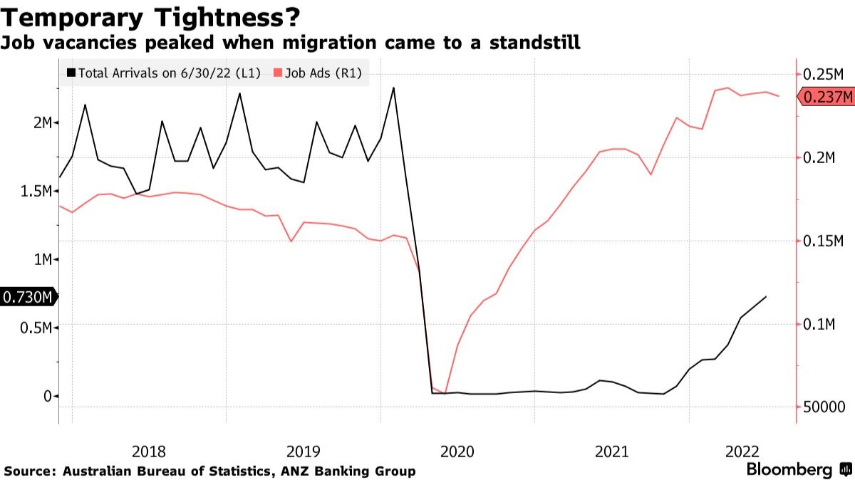 此前,澳大利亚在今年2月终于重新开放了其国际边界。但移民人数尚未恢复到疫情前的水平,再加上由于职位空缺一直徘徊在历史高位附近,这加剧了劳动力短缺。