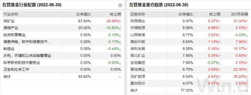 今年煤炭行情高涨,受益于此,黄海重仓煤炭、能源的三只基金脱颖而出,他的前十大持仓中煤炭能源股均占据7只,其余三只为地产股。Wind数据显示,截至6月30日,黄海在管基金行业配置中,有67.84%的仓位分布在采矿业、20.06%的仓位配置在房地产业。在今年上半年,黄海大幅提升采矿业的配置,较上期仓位增幅为20.99%,而房地产业有所下调,较上期减幅为15.83%。