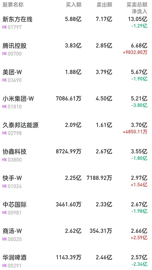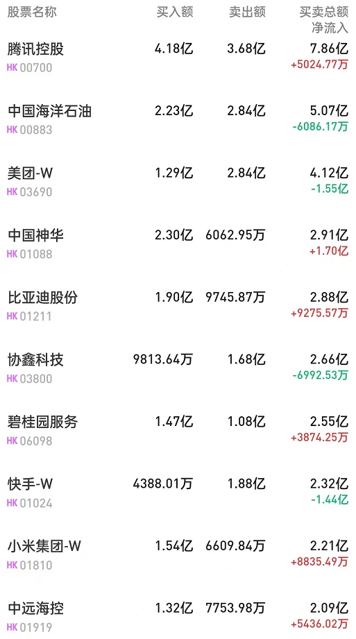 此外,久泰邦达能源(02798)、碧桂园服务(06098)、快手-W(01024)分别获净买入4850万、3874万、975万港元。而华润啤酒(00291)、中海油(00883)分别遭净卖出2.34亿、6086万港元。