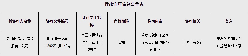智通财经APP获悉,9月2日,中国央行发布关于批准招商局金融控股有限公司设立许可的公告。公告称,根据《国务院关于实施金融控股公司准入管理的决定》《金融控股公司监督管理试行办法》等规定,央行审查并批准了深圳市招融投资控股有限公司的金融控股公司设立许可,并同意其更名为招商局金融控股有限公司。下一步,央行将继续依法依规、稳妥有序开展金融控股公司准入管理及持续监管。