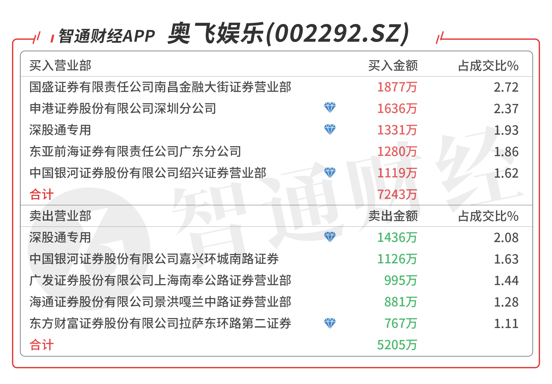 奥飞娱乐(002292.SZ):龙虎榜阵容豪华,深股通对倒净卖出105万元,买二是知名游资的席位买入1636万元,买五是顶级游资赵老哥的席位买入1116万元,当日净买入2368万元,该股要突破平台,成交量需进一步放大。