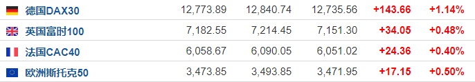 2. 截至发稿,德国DAX指数涨1.14%,英国富时100指数涨0.48%,法国CAC40指数涨0.40%,欧洲斯托克50指数涨0.50%。