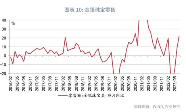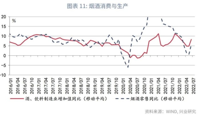 尽管经济总体延续弱复苏的格局,但不同行业的表现显著分化,部分行业逆势实现快速增长。从增长势头较好的行业来看,增长较快的行业主要分为两类。第一类是中高端消费。在2020年疫情后,社会消费品零售同比的中枢出现回落,但疫情对金银珠宝、烟酒零售的影响并不明显。2022年7月,金银珠宝零售三年平均增速达到14.5%的较高水平,高于2019年全年同比增速(0.4%);烟酒零售的三年平均增速为9.2%,高于2019年全年同比增速(7.4%)。