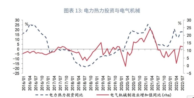 第二类是与电力投资相关的电气机械。在电力投资的带动下,7月电气机械制造业增加值同比增长12.5%,较全部工业增加值同比高出8.7个百分点。