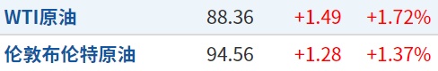 截至发稿,布伦特原油期货价格涨1.37%,报95.56美元/桶;WTI原油期货价格涨1.72%,报88.36美元/桶。