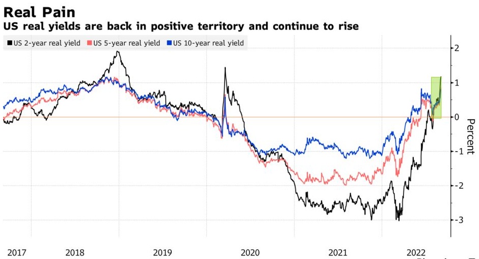 情况可能会变得更糟。华尔街交易员的想法是,不惜一切代价的鹰派美联储越来越决心通过压低股价和推高债券收益率来营造更紧缩的金融环境,以对抗不断加剧的通胀。这表明,几乎每一种资产类别的投资者都面临着市场出现新的混乱局面的风险,同时,高盛预计,10年期美国国债的实际收益率正在接近会严重限制经济活动的水平。