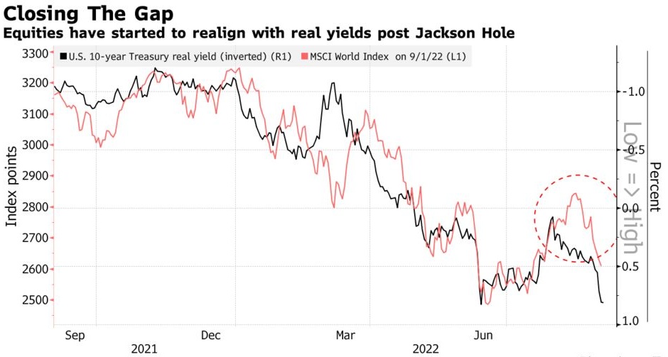 鲍威尔在杰克逊霍尔年度央行研讨会上发出了让投资者感到意外的鹰派信息,即借贷成本将需要上升,并长时间保持在可能限制经济增长的水平,以压低通胀;这让美国国债收益率的最新一轮飙升与6月份的动荡产生了呼应。自那以来,美国10年期和5年期实际利率分别上涨了约30和38个基点,而以科技股为主的纳斯达克100指数则下跌了8%。