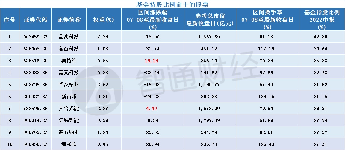 据2022年中报数据,获基金持股比例最高的晶澳科技区间内跌幅为15.9%,其次的容百科技跌幅则为31.74%。基金持股比前十的股票中仅有奥特维、天合光能实现正增长,区间内涨幅分别为19.24%、4.40%。
