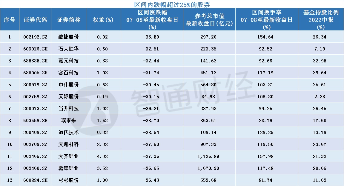 该指数有50只成分股,包含宁德时代、隆基绿能、通威股份、天齐锂业、TCL中环、亿纬锂能、恩捷股份等多只新能源赛道龙头股。其中,仅宁德时代、隆基绿能2只股票所占权重超过10%,分别为15.82%、11.51%,在7月8日至今的区间内,这两只基金的跌幅分别为15.23%、20.76%。