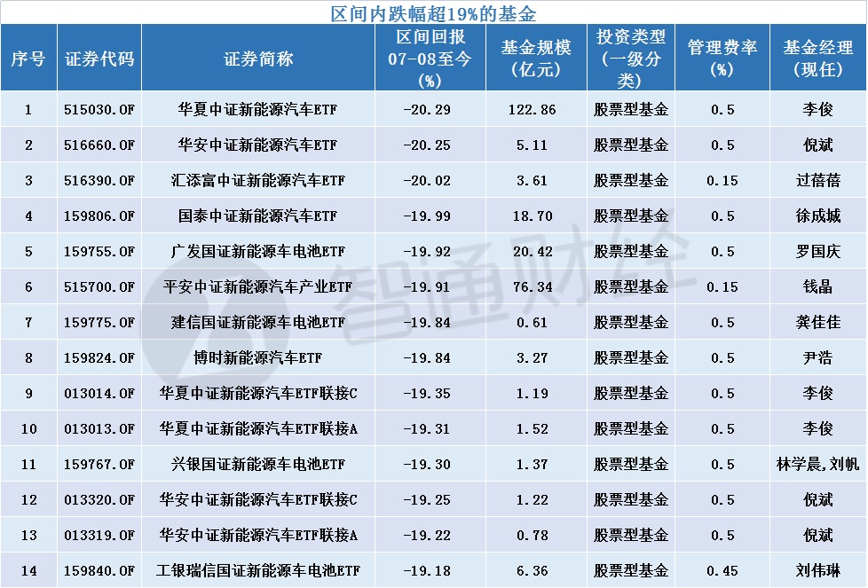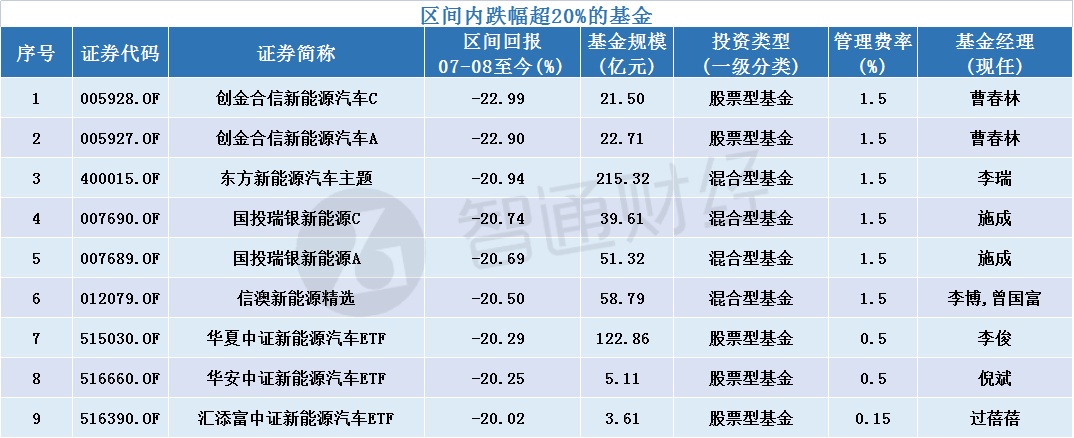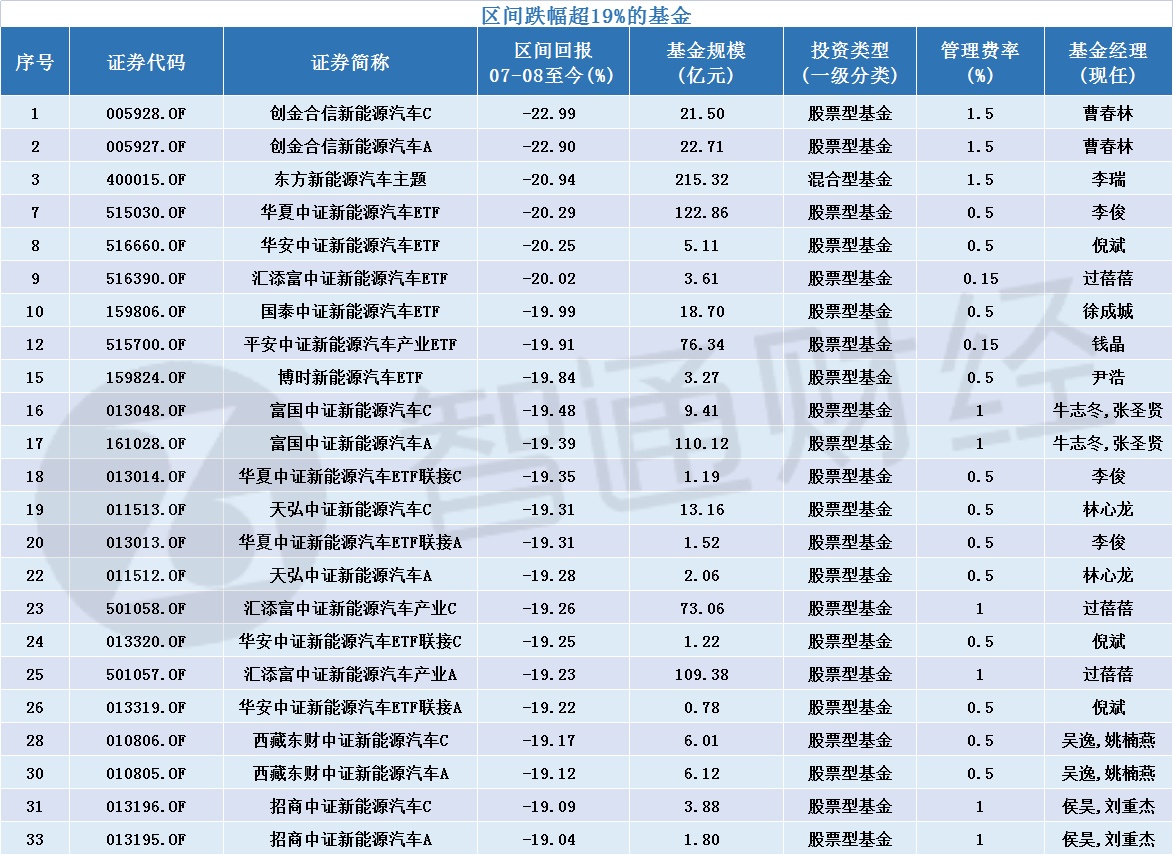 含“新能源汽车”字眼的基金区间回报更是“惨不忍睹”。49只基金中,区间内跌幅超15%的基金有37只,占比达到75.5%,区间内跌幅超过10%的有44只,占比达到89.8%。