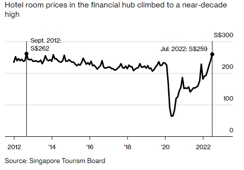 智通财经APP获悉,由于疫情限制的放松,新加坡的游客人数持续增加,推升酒店房价创下近十年新高。数据显示,新加坡7月的平均酒店房价为每晚259新元(184美元),同比上涨近70%,达到2012年9月以来的最高水平。这个城市国家正致力于定位为亚洲的旅游和商业目的地,未来几个月将举办一系列备受瞩目的活动。
