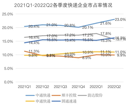 事实上,近期快递行业已经出现了市场份额加速向头部企业积聚的趋势。据统计,今年Q2期间中通、圆通、韵达、申通、顺丰五家公司的市占率约为76%,较去年同期上升了3个百分点。