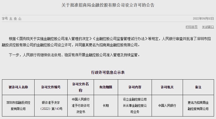 智通财经APP获悉,9月2日,中国人民银行官网发布公告称,根据相关规定,人民银行审查并批准了深圳市招融投资控股有限公司的金融控股公司设立许可,并同意其更名为招商局金融控股有限公司。至此,第三家金融控股平台诞生,此次招商金控从申请到获批,历时仅8个多月。