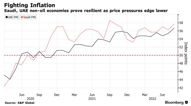 阿联酋的燃料价格下降导致该国投入成本自2021年1月以来首次下降。邻国沙特也受益于全球大宗商品价格放缓,并有望成为今年20国集团中增长最快的经济体。