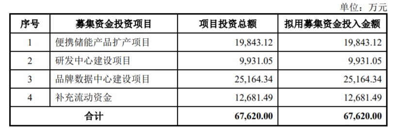 此次募集资金总额拟用于以下项目:约2亿元用于便携储能产品扩产项目;9931.05万元用于研发中心建设项目;约2.53亿元用于品牌数据中心建设项目;约1.27亿元补充流动资金。