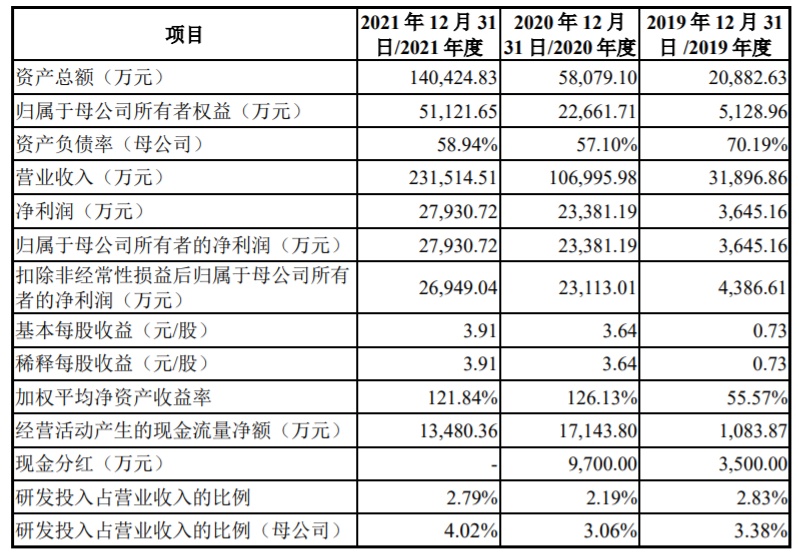 招股书显示,该公司2019年度、2020年度、2021年度营业收入分别约为:3.19亿元、10.7亿元、23.16亿元;净利润分别约为:3645.16万元、2.34亿元、2.79亿元。
