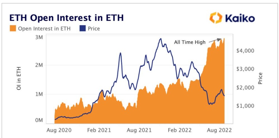 资产承压,但越来越多的交易员似乎正在进行杠杆看涨押注。总的来说,杠杆不断增长的最大催化剂可能是本月晚些时候备受期待的以太坊区块链升级。区块链研究公司Kaiko收集的数据显示,以以太坊计价的永久掉期合约未平仓合约在8月底达到历史最高水平。