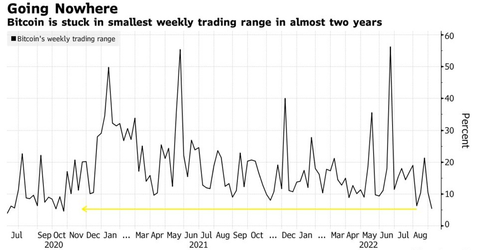 彭博社汇编的数据显示,比特币约占所有加密货币估计市值的40%,上周交易区间约为5.4%,为2020年10月以来最窄。两年前的沉寂之后,比特币价格出现了长达数月的飙升,最终在2021年4月将比特币推至当时的历史高点。