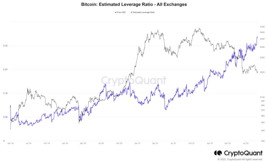 从某些方面来看,加密货币市场似乎有望突破近两年来最窄的交易区间。根据一项指标,市值最大的两大代币——比特币和以太币——的杠杆率处于历史最高水平,尽管它们的价格今年都下跌了50%以上。根据区块链数据网站CryptoQuant的数据,这是通过将永久掉期合约的未平仓合约数量除以交易所储备的比特币数量而得出的。