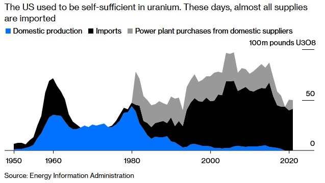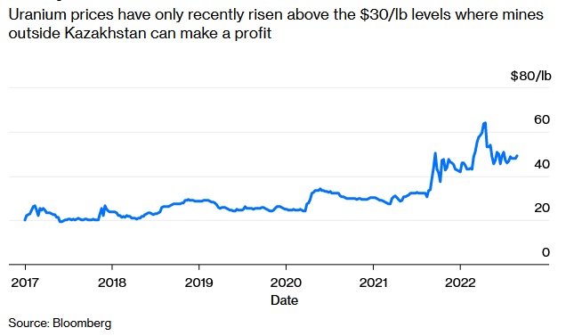 这一局面是近几十年来世界铀市场遭遇痛苦转变的结果。在21世纪头十年的后期,人们普遍认为,太阳能和风能的成本太高,到21世纪30年代仍无法与传统发电方式竞争,这推动了人们将核能作为唯一可行的大规模零碳能源的期望。这进而引发了以哈萨克斯坦为主的国家的铀矿开发热潮。