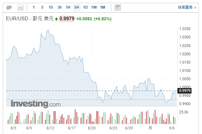 智通财经APP获悉,北溪一号停止供气后,加重的能源危机对欧元区经济及欧元造成了严重冲击,即使欧洲央行采取更激进的加息措施,也阻止不了欧元下滑。周一,欧元兑美元自2002年底以来首次跌破0.99。截至发稿,欧元兑美元报0.9979。