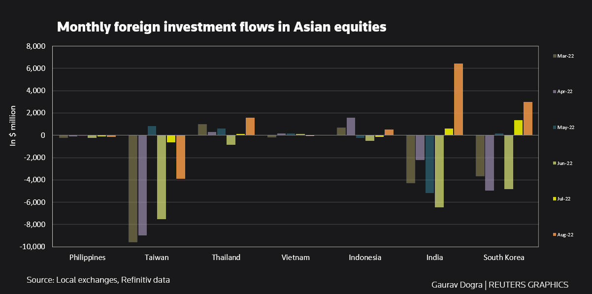 智通财经APP获悉,由于通胀预期减弱推动风险偏好上升,外资在8月大量涌入除中国外的亚洲新兴市场股市。来自韩国、印度、菲律宾、越南、印尼和泰国证券交易所的数据显示,外资购买了价值75.4亿美元的股票,创下2020年12月以来的最大单月净流入规模。