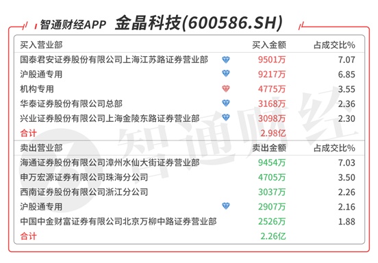 金晶科技(600586.SH):龙虎榜阵容豪华,机构席位买入4775万元,沪股通大单对倒净买入6311万元,买一是顶级游资章盟主的席位买入9501万元,买四是量化基金的席位买入3168万元,买五是知名游资苏州帮的席位买入3098万元,当日净买入7129万元,该股如突破前期高点,可看高一线。