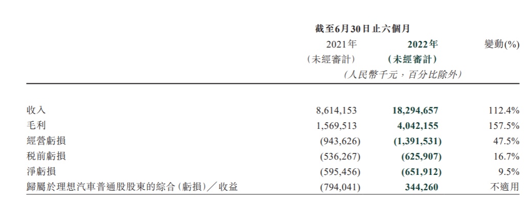 再结合半年报来看,今年上半年,理想汽车共交付60403辆汽车,同比增长100.3%;累计总交付量为184491辆;实现总营收182.9亿元,同比增加112.4%;净亏损为6.52亿元,较去年同期扩大9.5%;经营亏损为13.9亿元,较去年同期扩大47.5%。