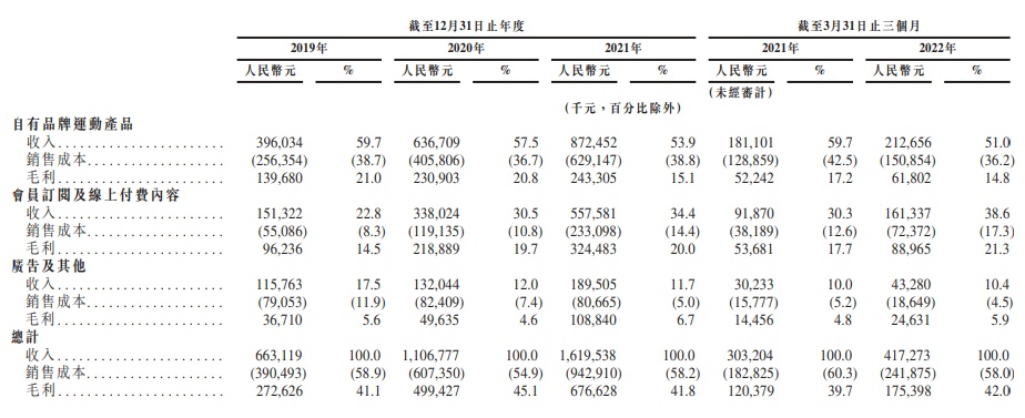 于2019年、2020年、2021年截至12月31日止,2021年、2022年截至3月31日止三个月,Keep Inc.收入分别为约6.63亿、11.07亿、16.20亿、3.03亿、4.17亿元人民币。毛利分别约为2.73亿、4.99亿、6.77亿、1.20亿、1.75亿元人民币。