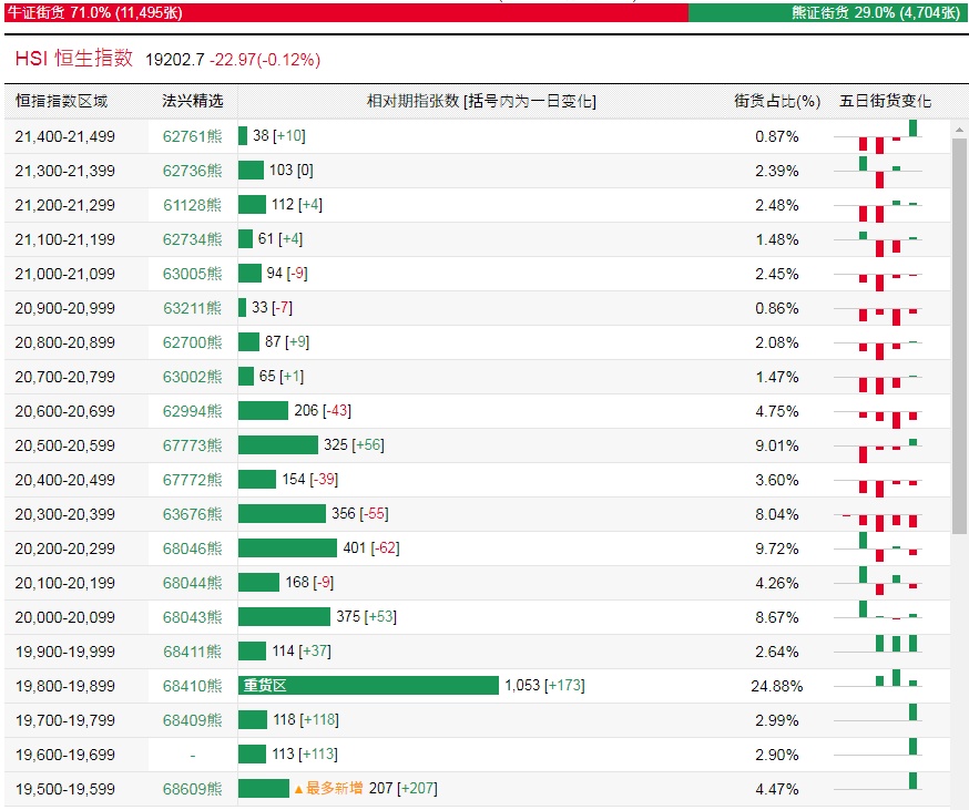 法兴恒指牛熊证街货分布图中的数据显示,熊证街货重货区在19800-19899区间,该区间最新熊证数量为1053张,较上一交易日增加173张;最多新增在19500-19599区间,该区间最新熊证数量为207张,较上一交易日增加207张。