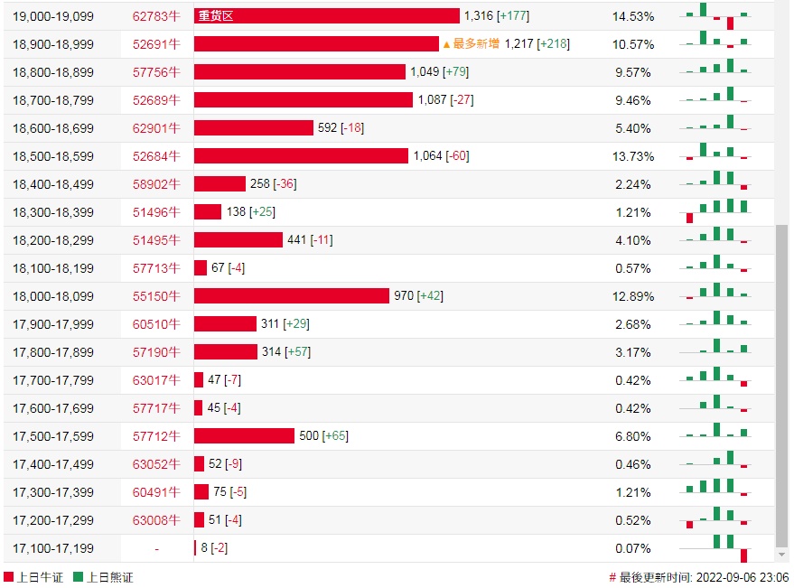 牛证街货重货区在19000-19099区间,该区间最新牛证数量为1316张,较上一交易日增加177张;最多新增在18900-18999区间,该区间最新牛证数量为1217张,较上一交易日增加218张。