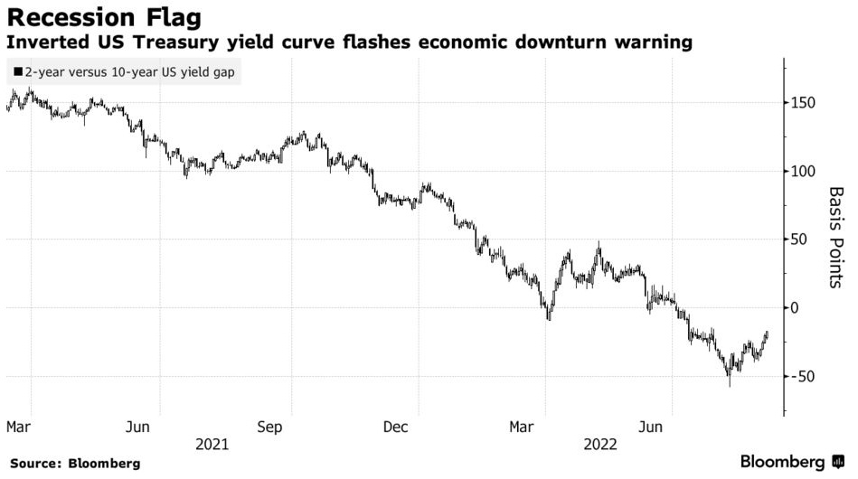 倒挂的美国国债收益率曲线是经济衰退的历史先兆,是一个市场指标,它仍在警告美联储,无法在不损害经济的情况下扭转通胀。两年期美国国债收益率目前比十年期美国国债收益率高出约17个基点。不过,这一差距已从8月初的58个基点大幅缩小。