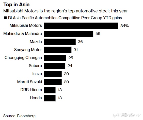 由于日元疲软,今年亚洲表现最好的10只汽车股中,有一半来自日本,但三菱汽车的股价涨幅是其他日本同行的两倍以上。马自达和斯巴鲁的股价上涨了20%以上,而丰田汽车(TM.US)的股价则下跌。