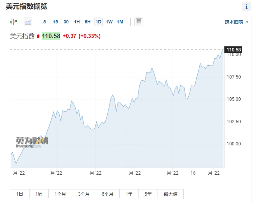 对于包括原油,在内的大宗商品而言,另一个不利因素是强势美元。在连续两日盘中刷新二十年高位后,美元周三延续涨势。截至发稿,美元指数涨0.33%,报110.58,再创二十年来新高。