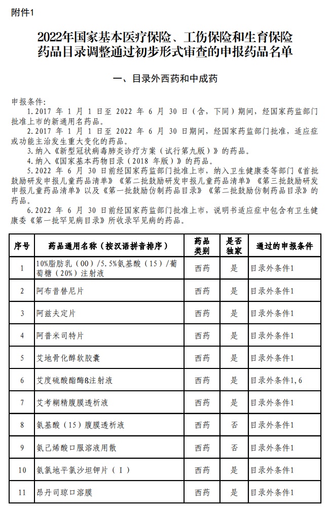 按照《2022年国家基本医疗保险、工伤保险和生育保险药品目录调整工作方案》和《2022年国家基本医疗保险、工伤保险和生育保险药品目录调整申报指南》,我局组织力量对2022年医保药品目录调整的药品申报资料进行了初步形式审查。现将通过初步形式审查的药品及相关信息予以公示。通过形式审查不等于纳入国家医保药品目录,后续还需要按程序开展专家评审、谈判竞价等环节。