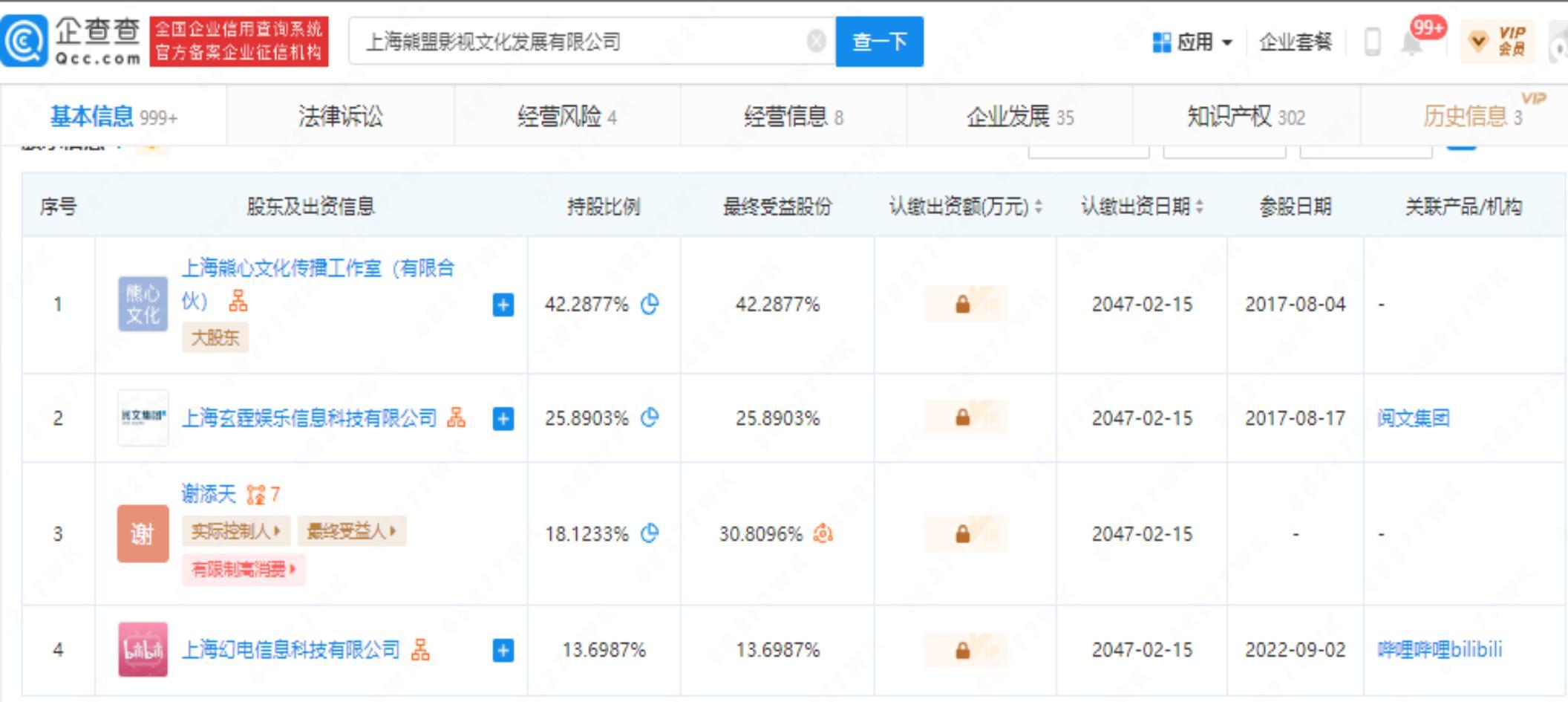 智通财经APP获悉,企查查APP显示,近日,上海熊盟影视文化发展有限公司发生工商变更,新增B站关联公司上海幻电信息科技有限公司为股东,持股13.6987%,同时公司注册资本由约71.43万增加至约82.77万。