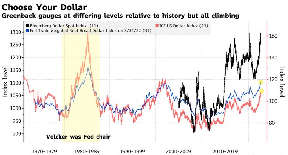 智通财经APP获悉,如果美联储主席鲍威尔真的决心做出“沃尔克式”的举措压制通胀,美元可能会进一步大幅上涨。尽管彭博美元现货指数周二攀升至纪录高位,但ICE美元指数却比1985年沃尔克任期后期的历史高点低了约三分之一。美联储自己编制的美元实际有效汇率指数比当年3月份的峰值低了约11%。