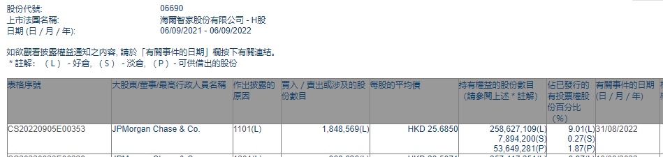 智通财经APP获悉,香港联交所最新资料显示,8月31日,小摩增持海尔智家(06690)184.8569万股,每股作价25.6850港元,总金额约为4748.05万港元。增持后最新持股数目约为2.586亿股,最新持股比例为9.01%。