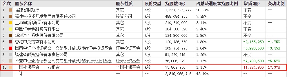 兴业证券二季度获社保基金118组合增持,增持股数为1122.49万股,变动比例达17.37%。增持后,118组合持有兴业证券7586.28万股,期末持股参考市值达5.35亿元。