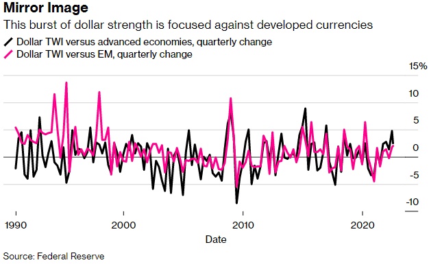 虽然美联储超预期收紧货币政策对全球货币产生的负面影响并不令市场感到意外,但这是多年来首次美元相对全球发达市场货币整体大幅走强,而不仅仅是相对新兴经济体。