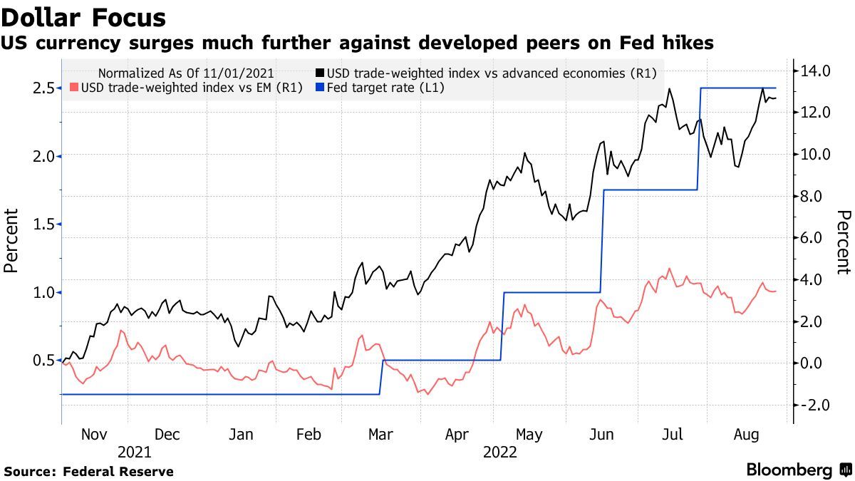 智通财经APP了解到,在美联储以一代人以来最激进的货币紧缩政策推动之下,美元走强使得其他国家货币汇率大幅走弱,推高了美元计价的进口商品成本,抑制财政扩张,同时助长了其他经济体的通胀水平。