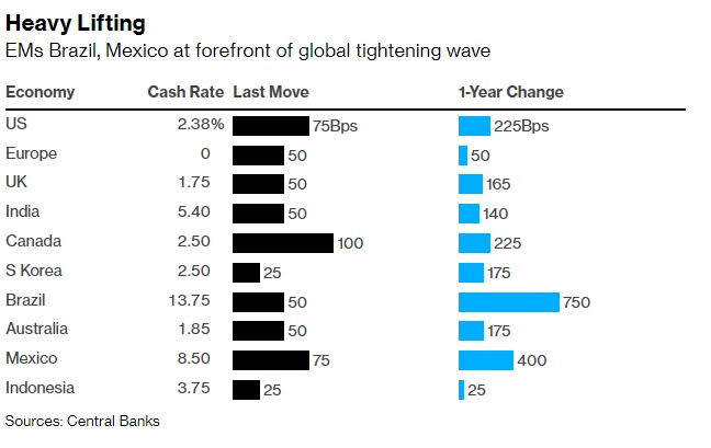 全球央行跟随美联储加息步伐,巴西、墨西哥等新兴市场已经处于全球紧缩浪潮前沿