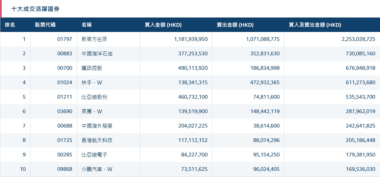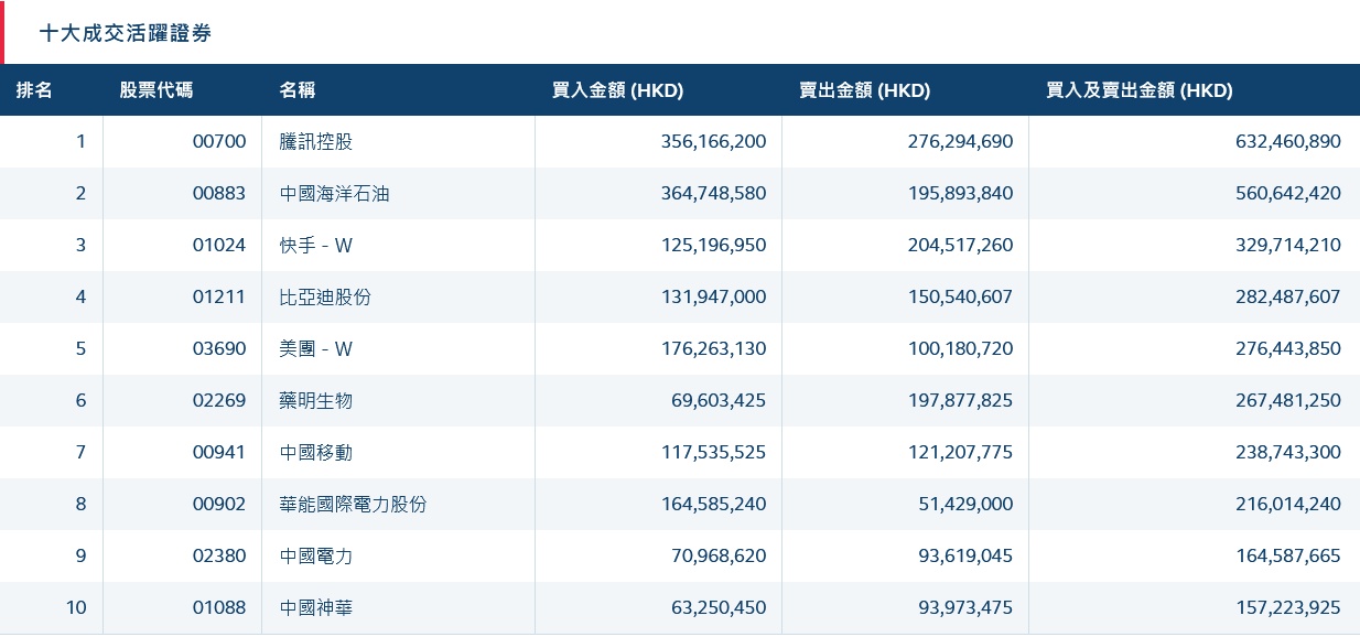 此外,中海油(00883)、美团-W(03690)、香港航天科技(01725)分别获净买入1.93亿、6716万、2903万港元。而中国神华(01088)、比亚迪电子(00285)、中国移动(00941)分别遭净卖出3072万、1092万、367万港元。