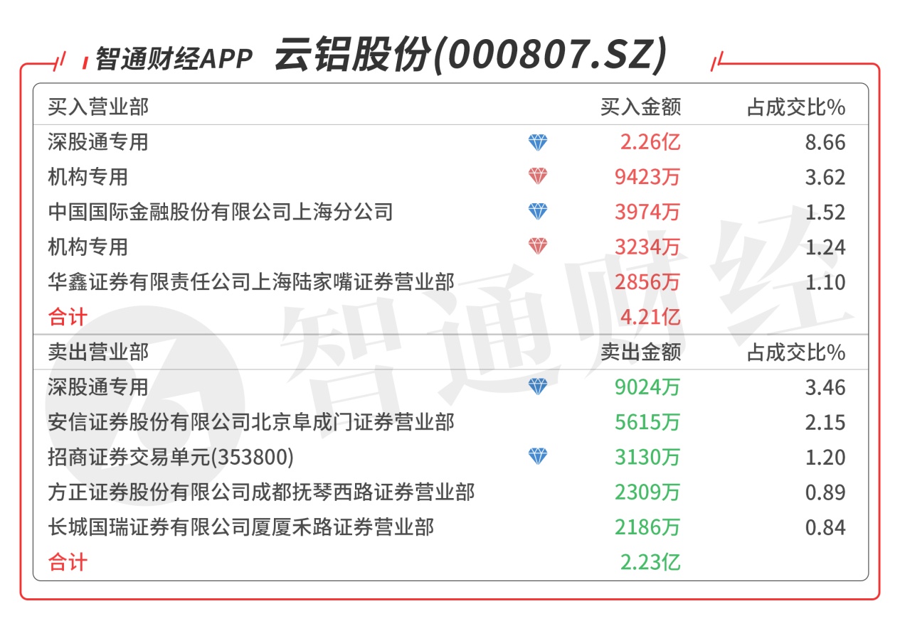 云铝股份(000807.SZ):龙虎榜阵容豪华,2家机构席位出现在龙虎榜单上,合计净买入1.25亿元,深股通大单对倒净买入1.36亿元,买三是量化基金的席位买入3216万元,当日净买入2.12亿元,该股今日强势突破半年线,预计压力位在年线附近。