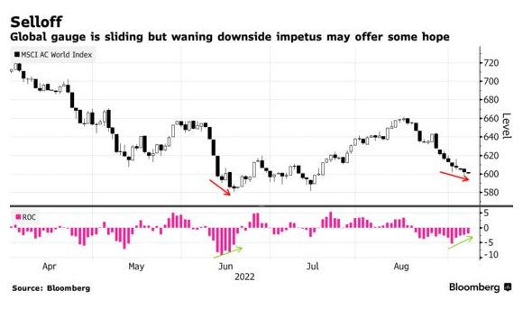 自8月中旬以来,摩根士丹利资本国际全球指数已下跌9%,如果跌至6月份的最低点,将达到2020年新冠疫情影响以来的最低水平。美联储为对抗通胀而收紧货币政策、欧洲能源危机以及亚洲经济放缓等一系列风险都在本轮下跌中发挥作用。