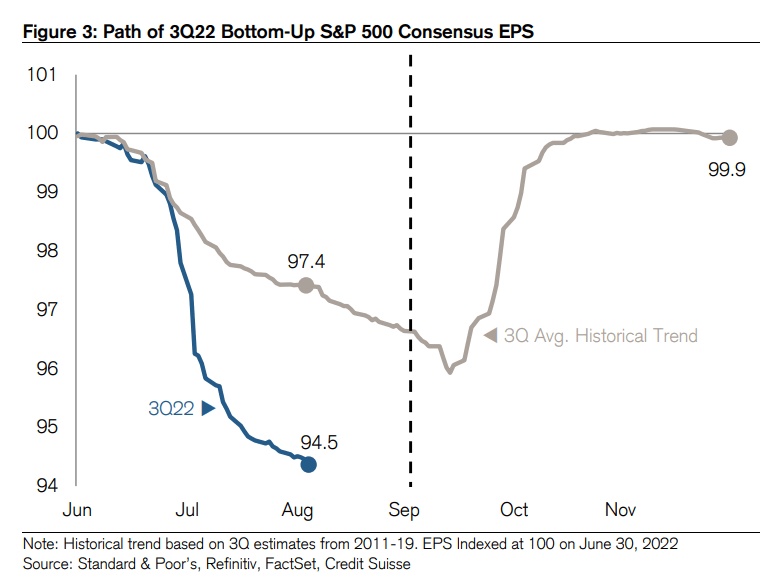 Golub表示:“自6月中旬以来,自下往上看,市场对第三季度和2023年的每股收益预期分别下降了-5.5%和-3.7%。”“考虑到第二季度强劲的正增长率(4.9%),这令人感到惊讶。虽然整个季度的预测都在下行属于意料之中的事,但最近的趋势明显比正常情况要弱得多。”